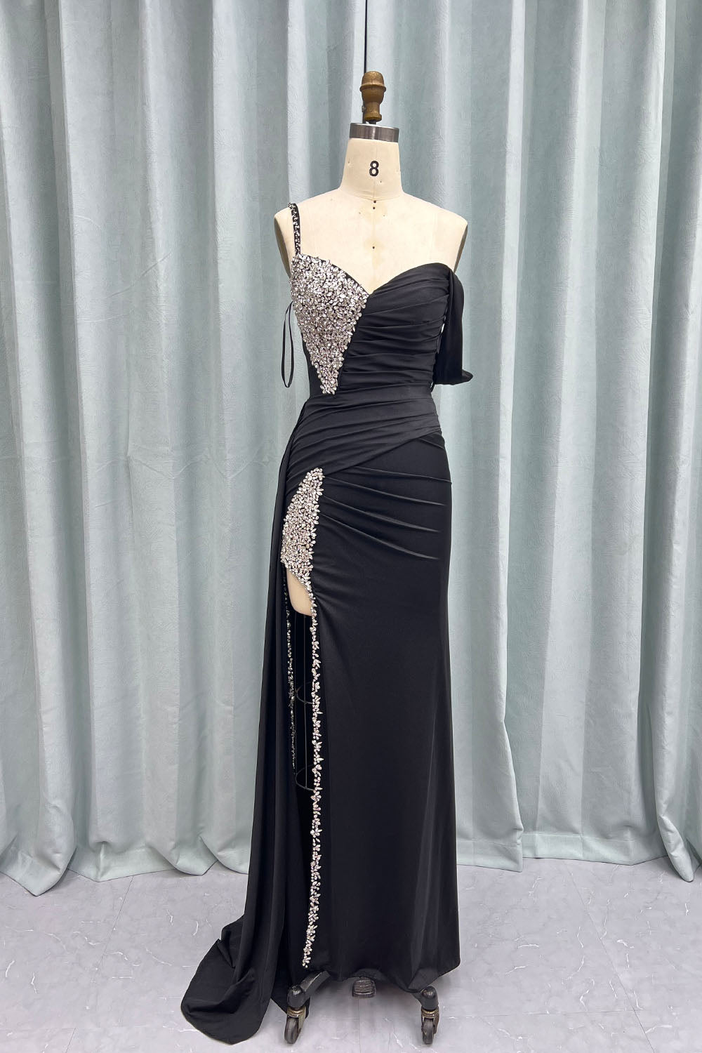 This captivating sheath-style gown. made from luxurious satin fabric. offers a sleek and flattering fit. Available in bold colors like fuchsia. peacock. red. black. and green. this gown exudes confidence and elegance. An ideal choice for both evening dresses and formal dresses. with its spaghetti straps and sleeveless design highlight the neckline. while the floor-length hem with a sweep train creates a graceful. dramatic effect. Beaded embellishments and pleats add texture and shine. making this gown perfect for a glamorous evening. The slit adds a touch of sensuality. and the lace-up back ensures a tailored fit for a flawless finish. making this gown an unforgettable choice for any special occasion.