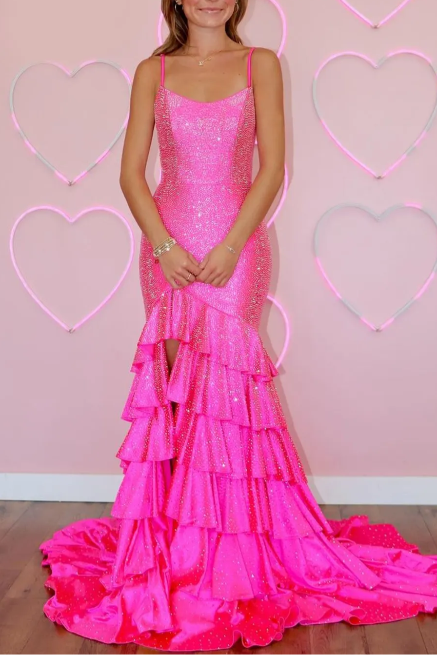 Get ready to turn heads in this stunning Mermaid Spaghetti Straps Rhinestone Ruffles Long Prom Dress with Slit. A fabulous selection for both evening dresses and formal dresses. with its mermaid silhouette and spaghetti straps add a touch of elegance. while the rhinestone embellishments and ruffled details make this dress truly unique. And with a sultry slit. you'll feel confident and glamorous all night long. Perfect for prom or any special occasion.