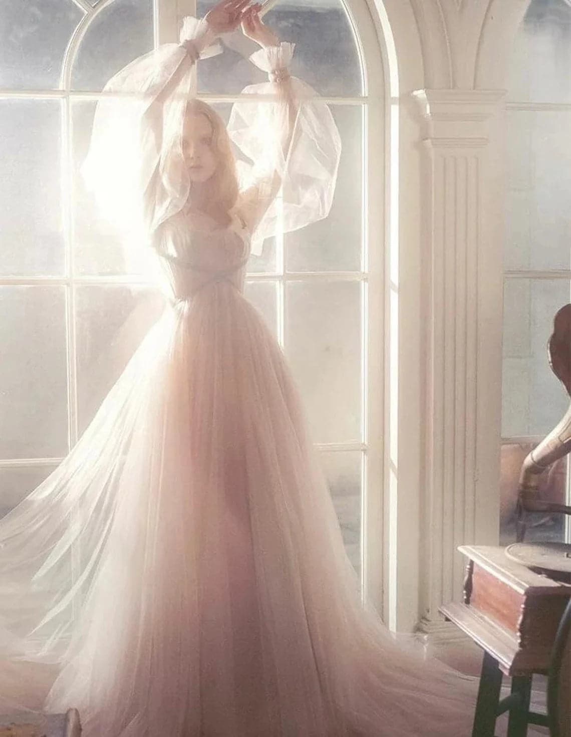 Occasion: Engagement. Birthday. Formal EveningStyle: Elegant. BohoSilhouette: A-LineHemline / Train: Sweep / Brush TrainNeckline: Scoop NeckFabric: TulleClosure: Zipper UPSleeve Length: Long SleeveEmbellishment: Pleats. RuchedBuilt-In Bra: YesBoning: YesTips: Professional dry cleaner only. Colors may vary slightly due to different monitor settings