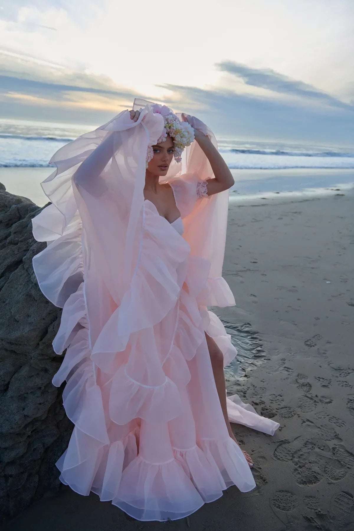 Pink Organza Ball Gowns Short Puff Sleeves Ruffles Prom Party Dresses Slit Princess Formal Women Party Dresses.