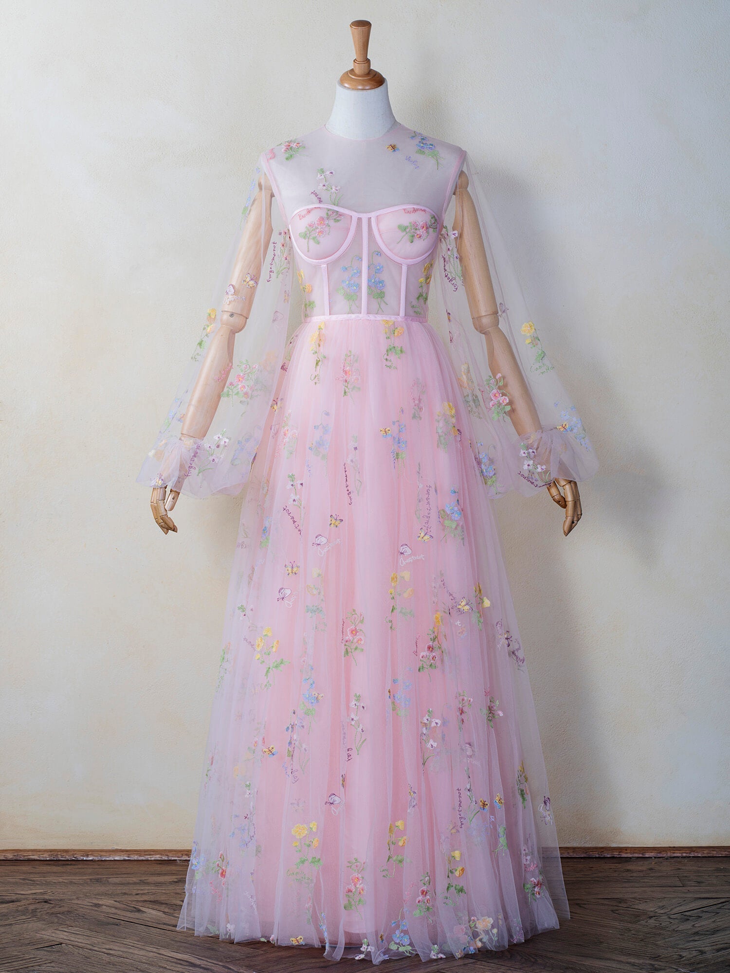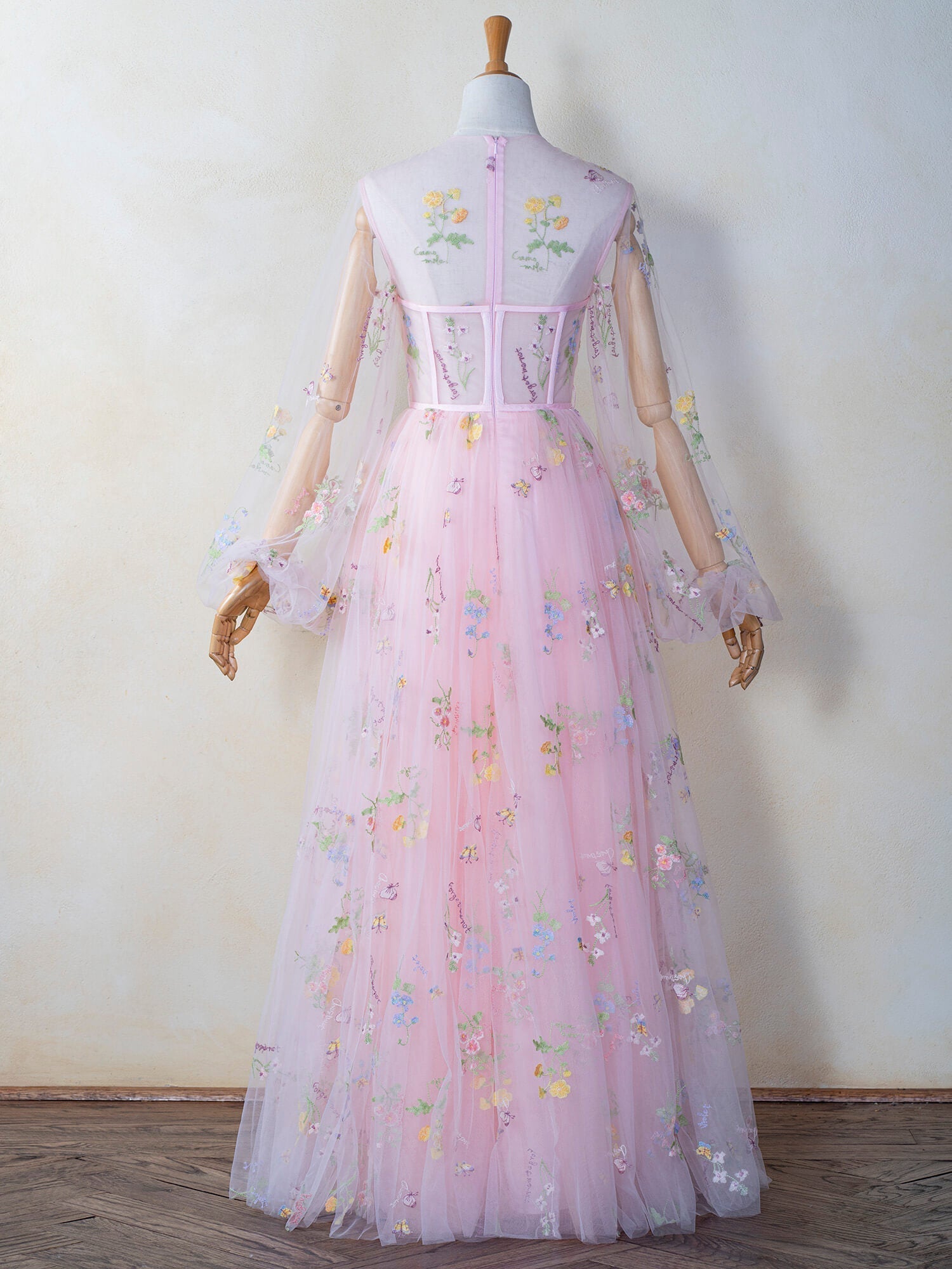 Revel in sensorial spring blooms in the Illusion Neck Floor Length Tulle Pink Prom Dress. Dance the delightful day away in sheer layers of pastel pink tulle. Embroidered with flowers and structured with a corset with built-in pads and boning. Leave a trail of baby pink fairy dust behind you in this angelic gown you won want to take off.
