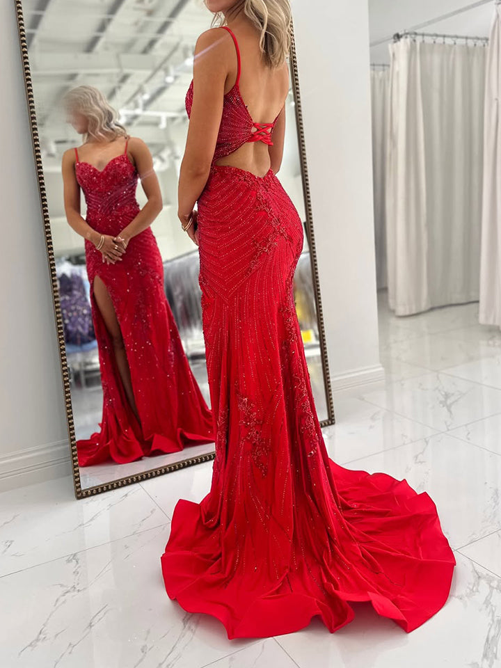 - Features: Sheer Corset Bodice. High Side Slit. Intricate Beading. Open Back