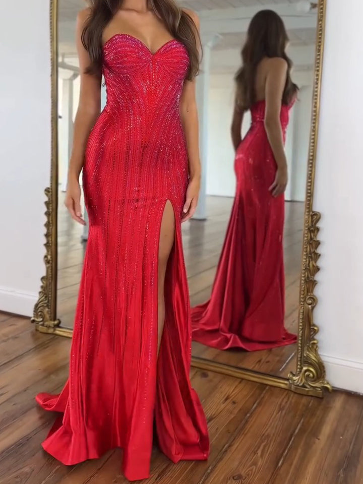 Shine like a starry night in this exquisite midnight blue prom gown. The dress features a classic strapless sweetheart neckline and a structured bodice designed with vertical seaming to elongate the torso. The entire gown is embellished with a stunning linear pattern of sequins and beads that trickle down the length of the dress. creating a mesmerizing. slimming effect. A daring high thigh slit adds movement. while the back view reveals a functional lace-up corset closure. ensuring a perfectly customized fit. This gown is a sophisticated choice for prom. galas. or any evening event where you want to sparkle with elegance.