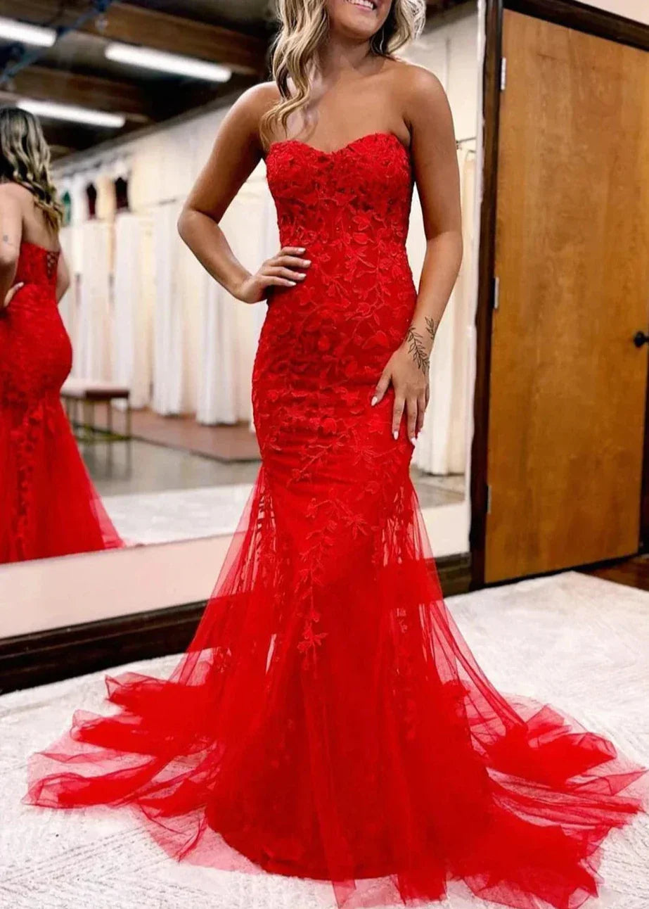 Grace the dance floor in a luxurious mermaid-style gown that's the epitome of glamour and sophistication. From the lace-up back to the floor-length sweep train. this dress is a stunner in every sense of the word. Sculpted in a fine blend of lace and tulle fabric. the Evie gown effortlessly molds to your curves. while the strapless neckline accentuates your shoulders and décolletage. The bodice features an illusion corset design. sprinkled with exquisite lace appliqués that cascade seamlessly into the skirt. choose it. a gown that says you're not here to merely fit in. but to stand out.