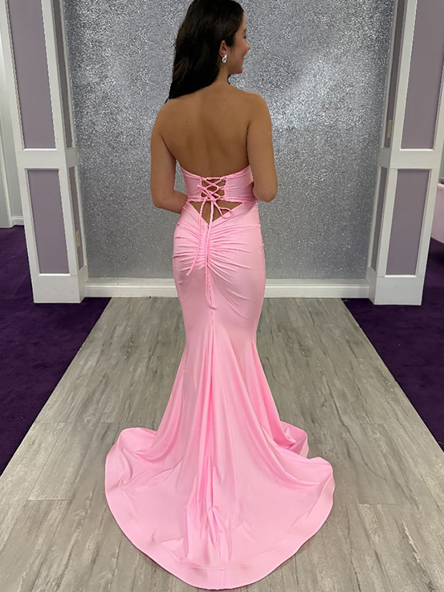 Channel playful elegance in this bubblegum pink prom gown. Designed for the modern fashionista. this dress features a flirty strapless sweetheart neckline with soft ruching at the bust. The standout detail is the trendy double keyhole cutout design at the midriff. adding a daring peek-a-boo element to the bodice. The silhouette hugs your curves in a sleek fit-and-flare shape before cascading into a dramatic mermaid skirt with a sweeping train. Crafted from smooth. form-fitting fabric. this gown ensures you look chic and feel comfortable all night long. Perfect for prom. Sweet 16s. or any event where you want to make a fun. vibrant statement.