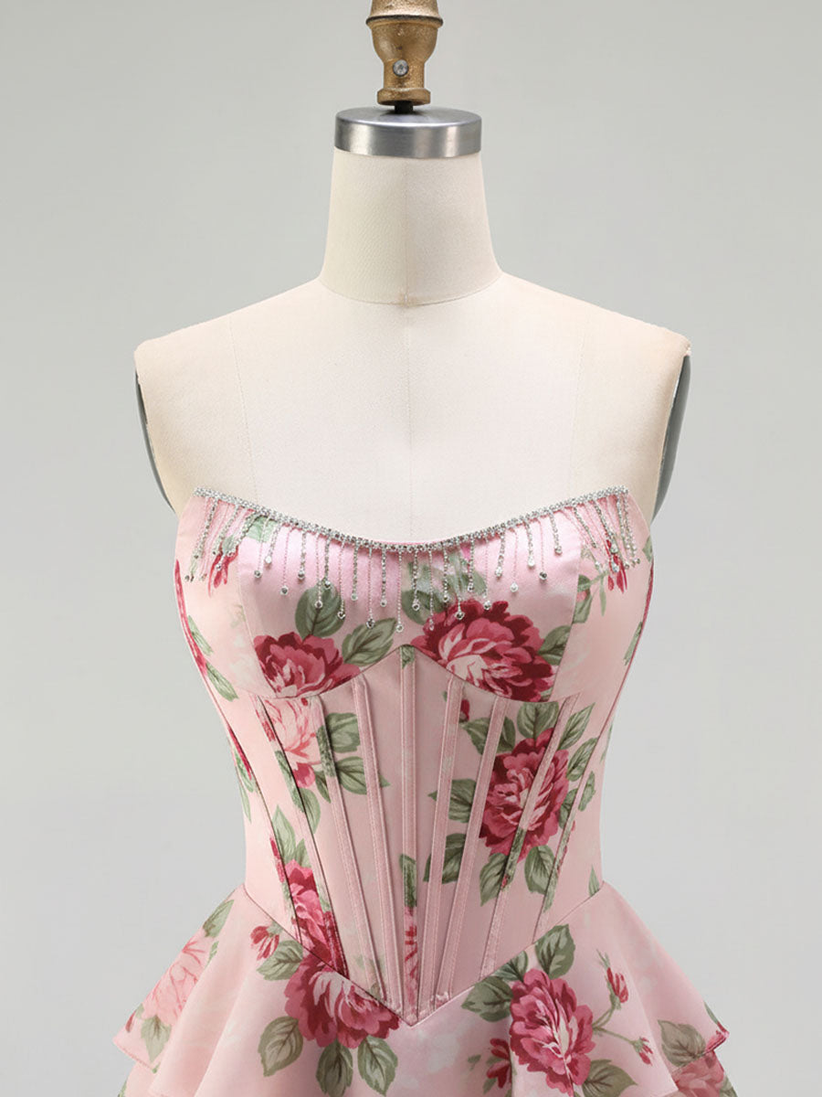 - Features: Corset Bodice. Tiered Skirt. Sparkling Neckline. Floral Detailing