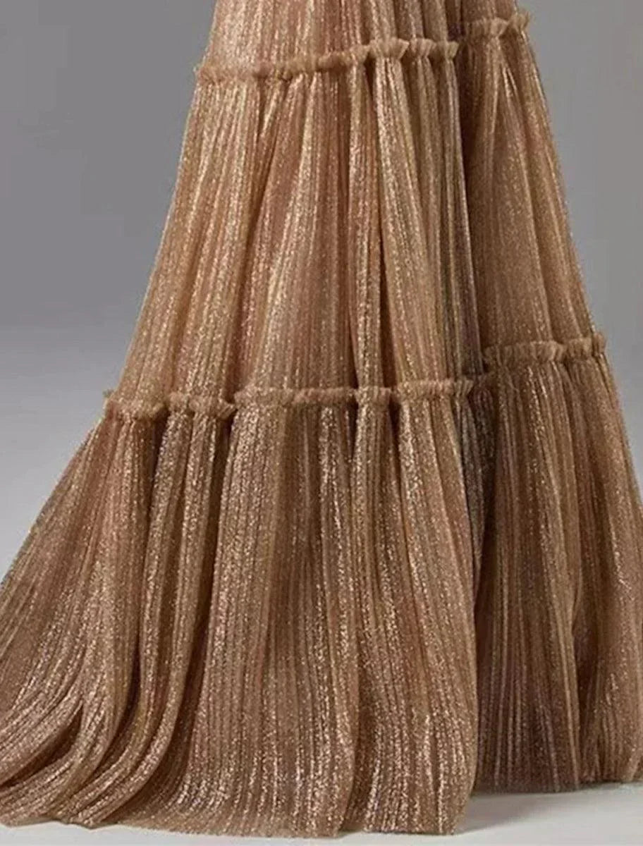 A-Line Evening Gown Glittering Dress Formal Wedding Guest Floor Length Sleeveless Strapless Tulle with Pleats