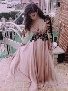 LBQ0521 features high quality satin but the price is very nice. A line is very friendly to your curve, which is suitable for everyone. V Neck , long sleeves and open back  are very gorgeous. Appliques will let you be more chic and sexy. Shop at AlinePromDress! You deserve it.